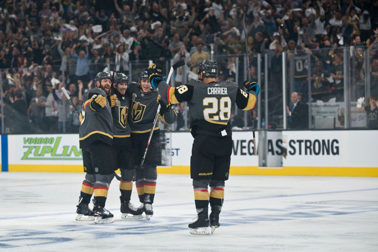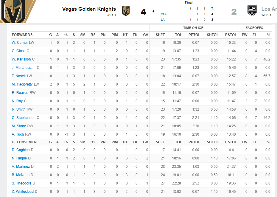 MId-way through the third period, the Knights’ William Carrier scored and gave the Knights a two-goal lead at 4-2. VGK defenseman Nic Hague was credited initially for the goal, but it appeared as if Carrier got a piece of the shot. In fact, there was a scoring change with Carrier getting the goal, with Hague getting the assist.