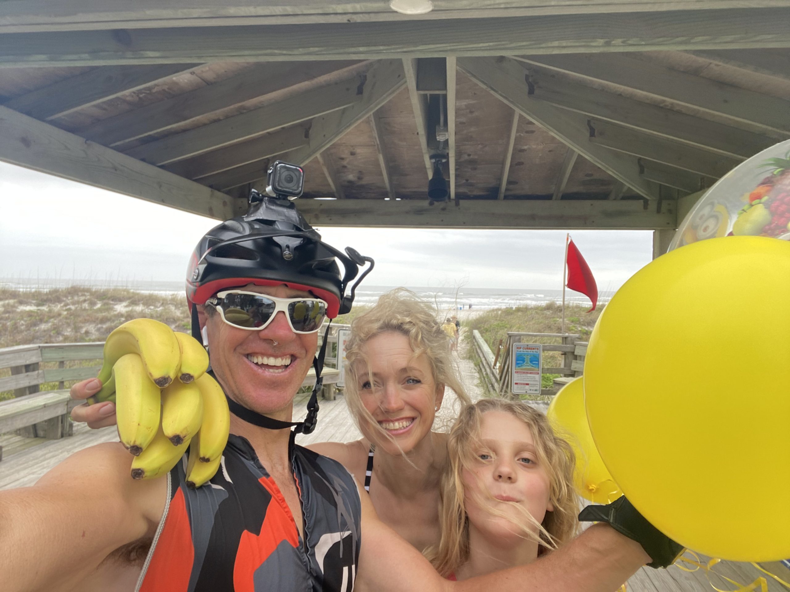His bicycle rig touched the foamy waters of the Atlantic Ocean today and his wife and daughter joyfully greeted him in St. Augustine, Florida, to celebrate another Jared Fisher command performance on two wheels.
