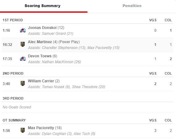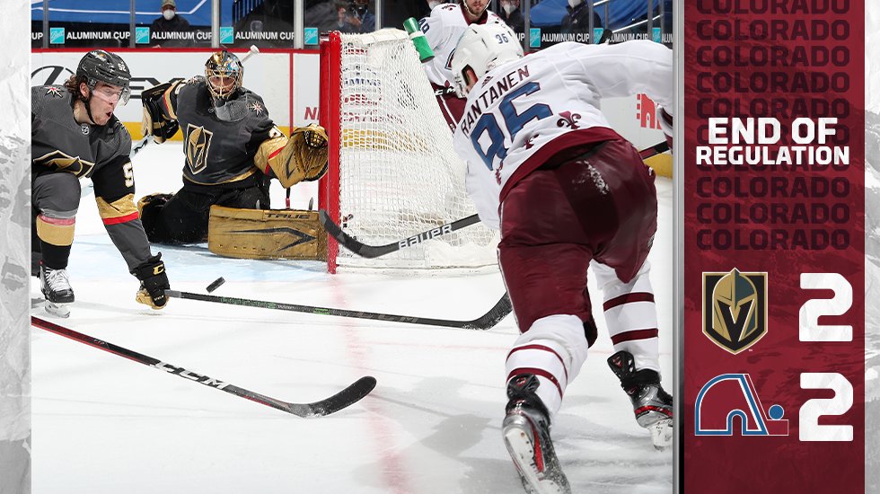 The two teams fought to a 2-2 tie after three periods in Denver Saturday afternoon, with the Knights relying on the unlikely goal scorers of defenseman Alec Martinez (4th goal of the season) in the first period and forward William Carrier (2nd goal of the season) in the second period.