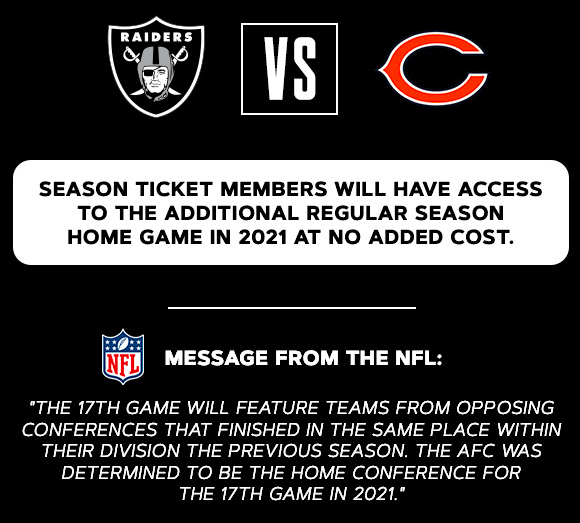 Las Vegas Raiders season ticket holders will be treated to a ninth regular-season home game in 2021 thanks to the NFL’s new 17-game regular season schedule.
