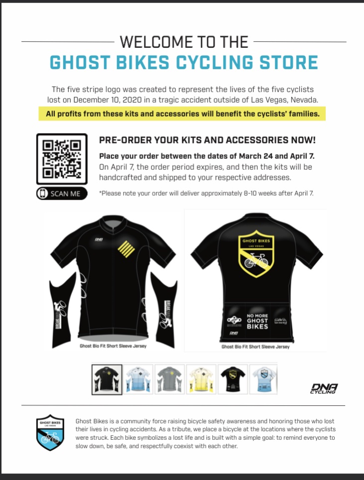 Several bicycle safety organizations have worked with Ghost Bikes Las Vegas to also raise money for the families of the five cyclists who were killed. They are also raising money by selling matching bicycle jerseys and shorts called kits.  You can purchase those here.