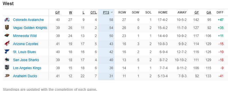 The Knights are 26-11-2 and trail Colorado (27-9-4) by four points with a game at hand. Arizona (19-17-5) lead St, Louis by a single point for the fourth and final playoff berth.