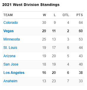 The Knights have won four straight games and improved to 29-11-2 as they attempt to catch division-leading Colorado. The Avalanche defeated St. Louis, 4-3, to stay four points ahead of Vegas Wednesday,