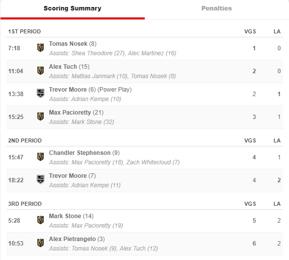 The 4-1 lead was cut to two goals late in the middle stanza when LA’s Moore scored his second of the game and the Knights went into the second intermission leading. 4-2.