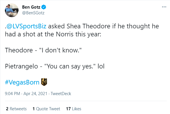 I asked Theodore via Zoom if he thinks he has a crack at winning the Norris Trophy for the league’s best defenseman with seven goals and 33 assists, for 40 points — two points off the lead.