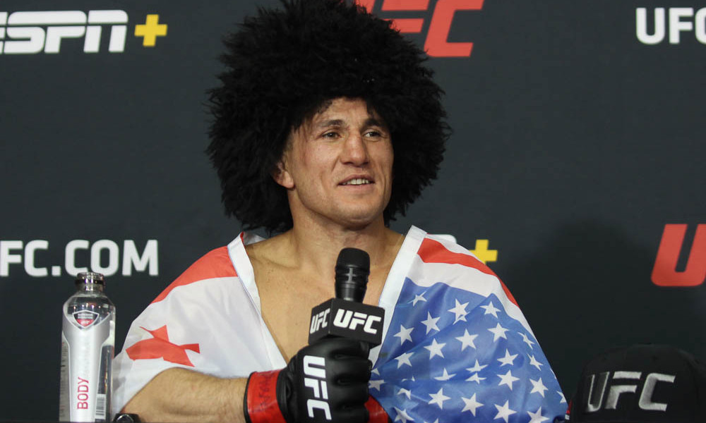 Merab Dvalishvili took UFC veteran Cody Stamann three rounds to earn a decision victory. The No. 12 ranked bantamweight walked into the Octagon draped in the Georgian and US flag sewn together as one. He also wore a papakha head covering similar to his Dagestan neighbor, and former lightweight champion Khabib Nurmagomedov. Training out of Long Island, NY, Dvalishvili spoke no English when he arrived in the US eight years ago.