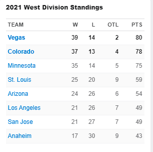 The door is open for Colorado to win the division. If the Avalanche win both games against the LA Kings in Denver Wednesday and Thursday, the Avs will be the number one seeded team in the division as its winner and play St. Louis in round one while VGK would play Minnesota with the home ice.