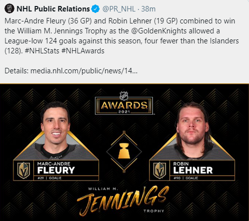 The Knights scored twice in each period and cruised to the win. Future Hall-of-Famer Marc-Andre Fleury notched his sixth shutout of the season with Fleury and fellow Knights netminder Robin Lehner combining to snare the Jennings Trophy for fewest goals allowed in the NHL.