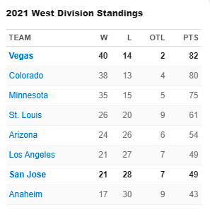 The Knights won their 40th game out of 56, including eight-for-eight with a season sweep of the once-formidable San Jose Sharks.