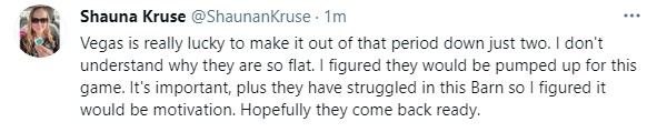 After the first 20 minutes, Minnesota 2 Vegas 0, with the Knights mustering a mere four shots on goal.