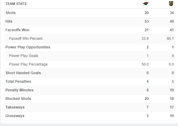 Shots on Goal: Vegas, 34; Minnesota, 20