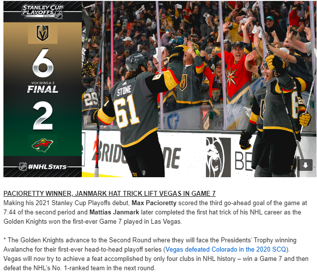 With Season On The Line, Golden Knights Defeat Minnesota, 6-2, In Game 7 Friday With Janmark Hat Trick, Pacioretty Game-Winner