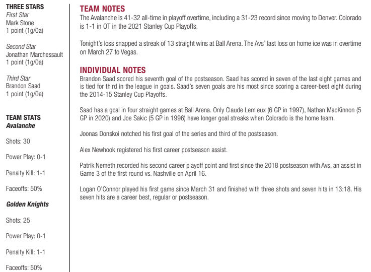 Just the facts: Vegas 3 Colorado 2 in overtime in Game 5, Ball Arena, Denver