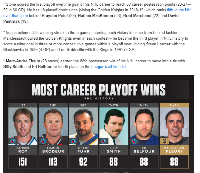 VGK scorers: Alex Tuch, Jonathan Marchessault, Mark Stone (game-winner, 50 seconds into OT)