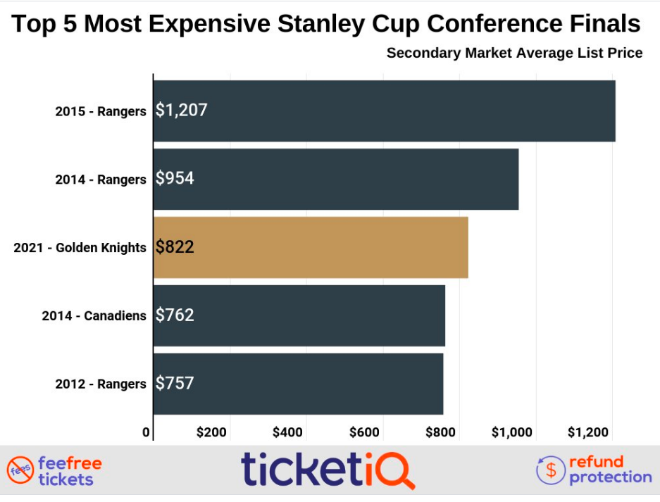 The average Golden Knights’ ticket price for the NHL semifinal matchup with the Montreal Canadiens is $822 on the secondary market, according to TicketIQ, which tracks secondary market ticket prices.