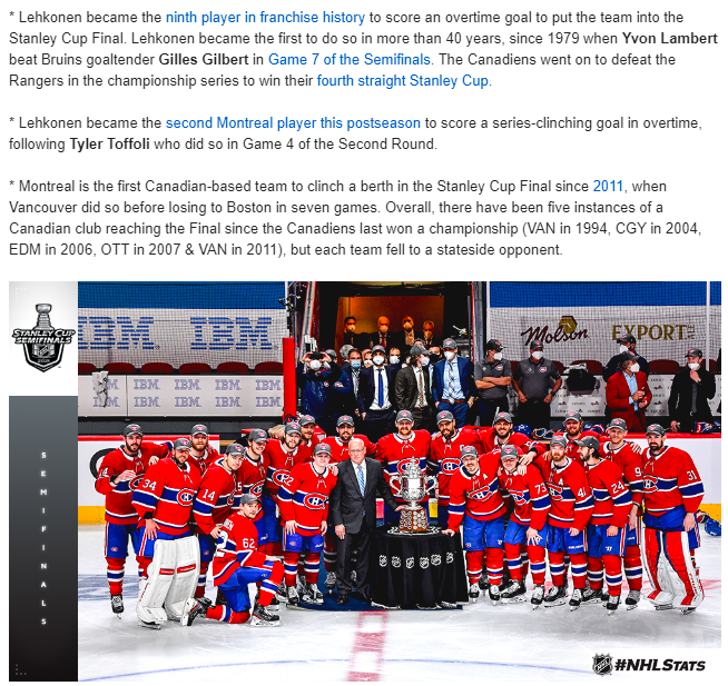 Montreal is the first Canadian team to appear in the Stanley Cup Final in a decade. The Canadiens were the last team from north of the border to win the Stanley Cup in 1993.