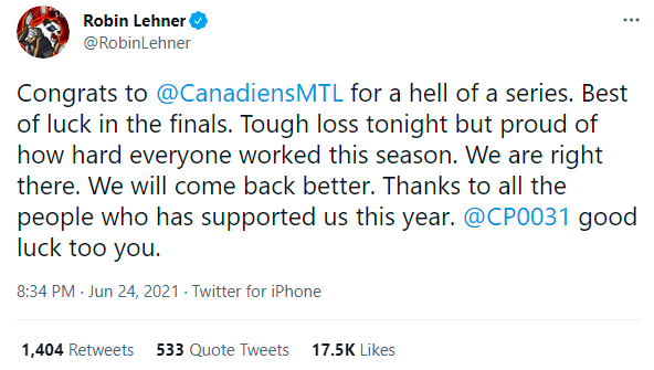 Here’s Robin Lehner, the VGK goaltender, summarizing the defeat: