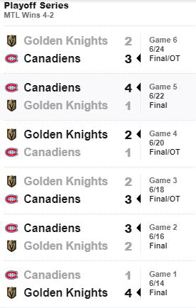 Montreal defeated Vegas three times this series by that same 3-2 score. After Vegas won the first game, 4-1, Montreal took four of the next five games.
