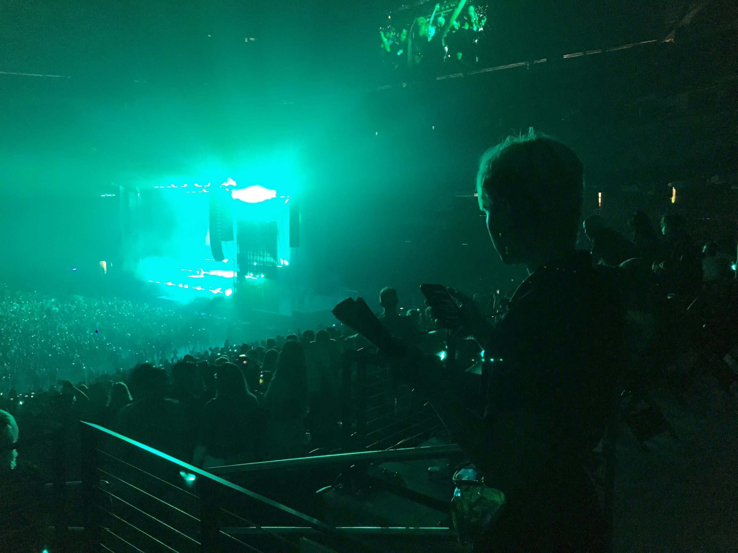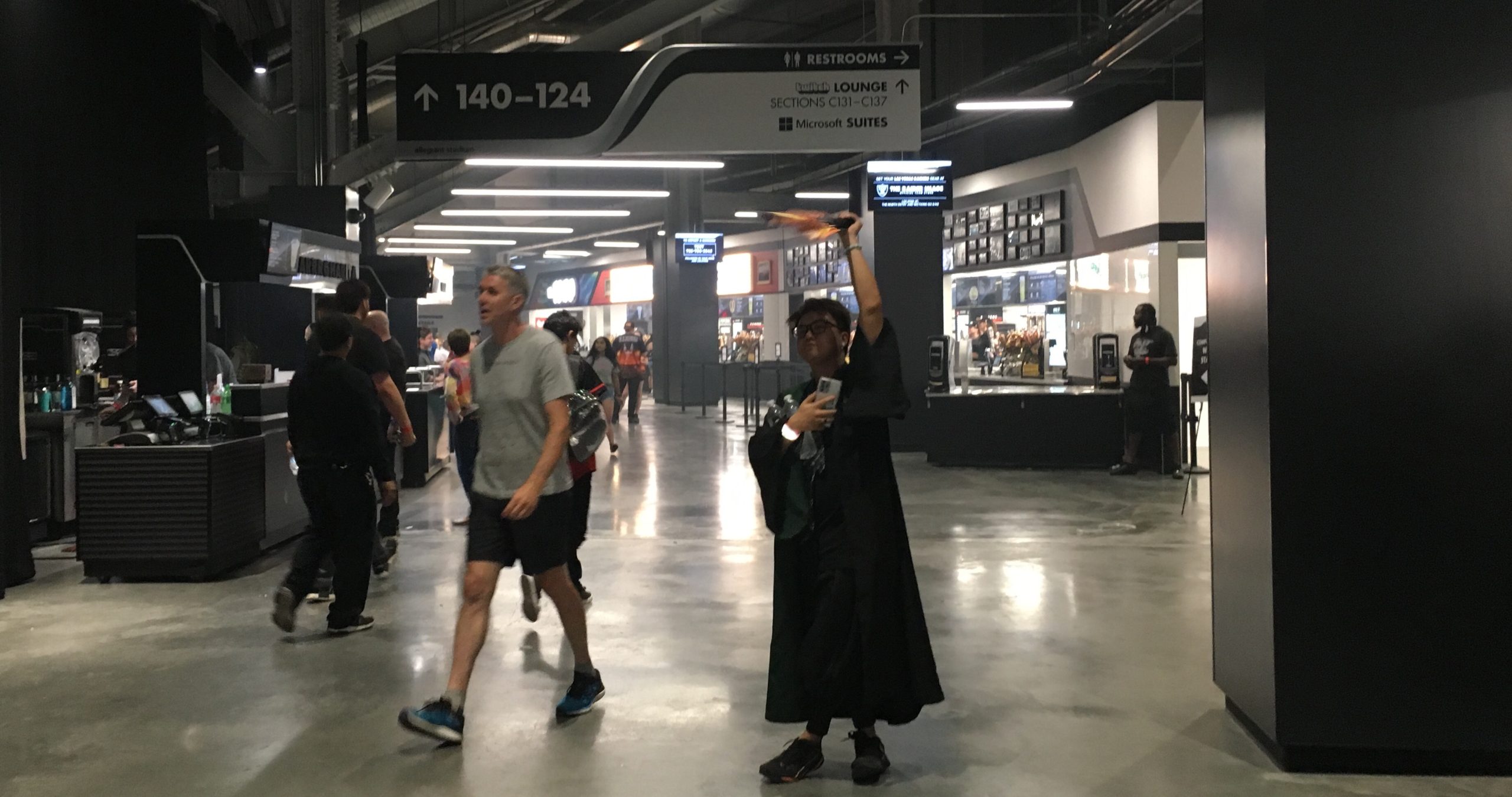 Fans were on the event floor — the concrete pad that would be below the tray of grass that serves as the playing field for the Raiders. Much of the 100 and 300 levels were filled as the stage was on the south end of the stadium and facing north.