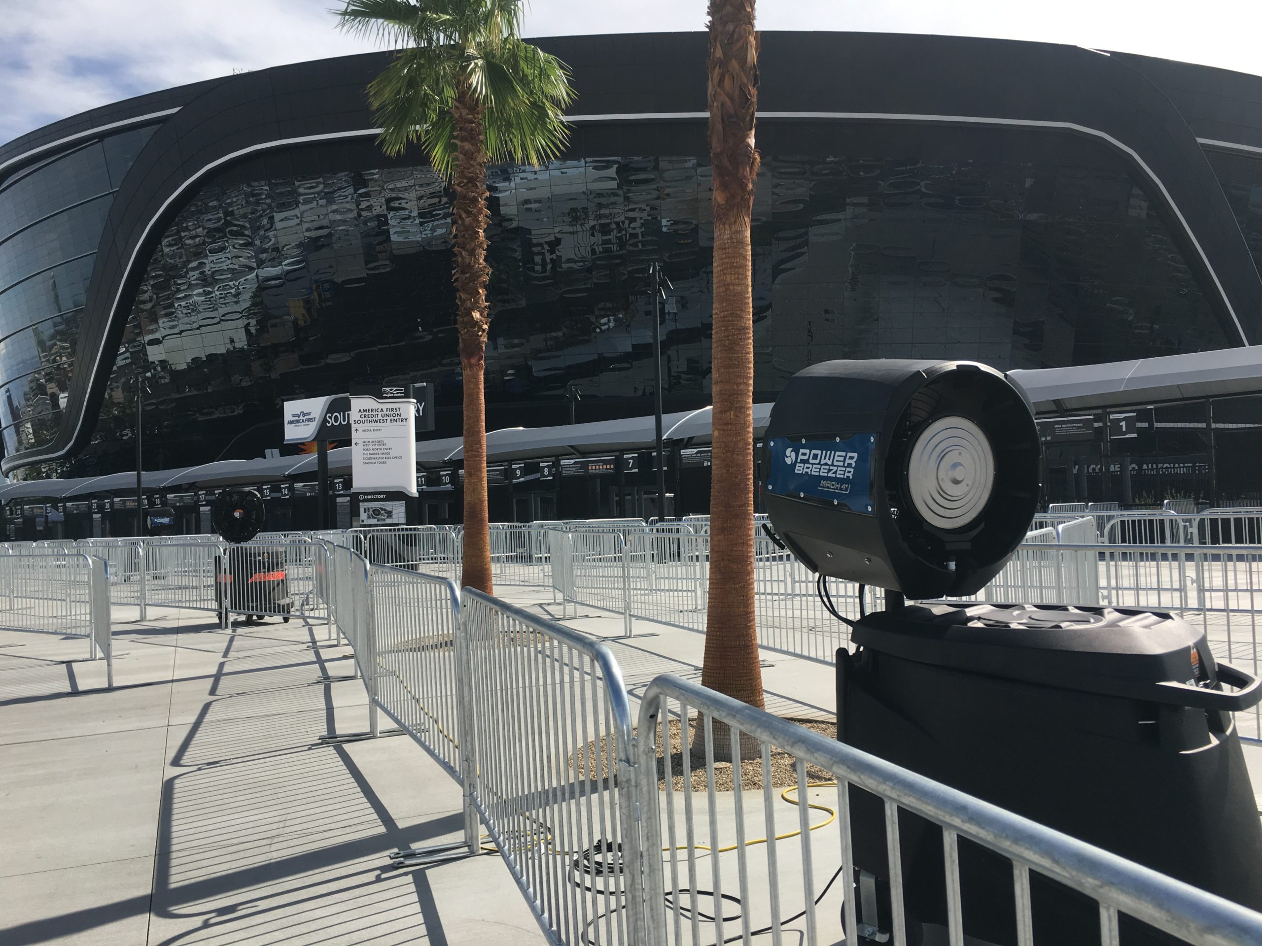The giant fans were arranged along the metal barriers that will funnel tens of thousands of fans to the turnstiles.