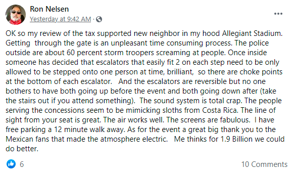 I think the visitor experience will far exceed the local experience in terms of satisfaction. — Stadium visitor observation after Sunday’s game at Allegiant Stadium
