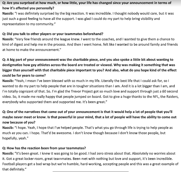 Raiders defensive end Carl Nassib, who announced he was gay this year, met the media today at Raiders headquarters and camp in Henderson. Here are several media Q and As from the media session.