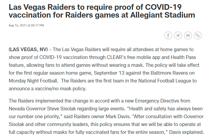 “After consultation with Governor Sisolak and other community leaders, this policy ensures that we will be able to operate at full capacity without masks for fully vaccinated fans for the entire season,” Raiders owner Mark Davis said in a media release.