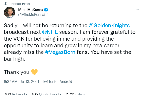 The Knights also did not bring back TV broadcast analyst Mike McKenna, who relayed the news two months ago via Twitter: