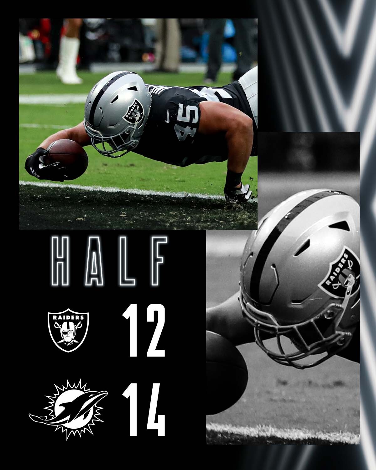 A late second quarter drive by Miami ended with kicker Jason Sander doinking the upright on a FG attempt and the Raiders went into the half down down by two points. The Raiders outgained Miami in yards, 218-131, in the first half.