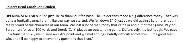 “Maybe my pregame speeches aren’t very good,” Gruden after the game.