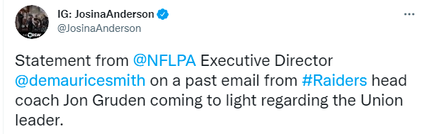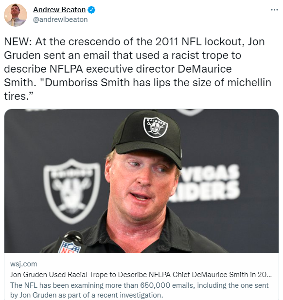 AP quoted NFL spokesman Brian McCarthy as saying, “The email from Jon Gruden denigrating DeMaurice Smith is appalling, abhorrent and wholly contrary to the NFL’s values. We condemn the statement and regret any harm that its publication may inflict on Mr. Smith or anyone else.”