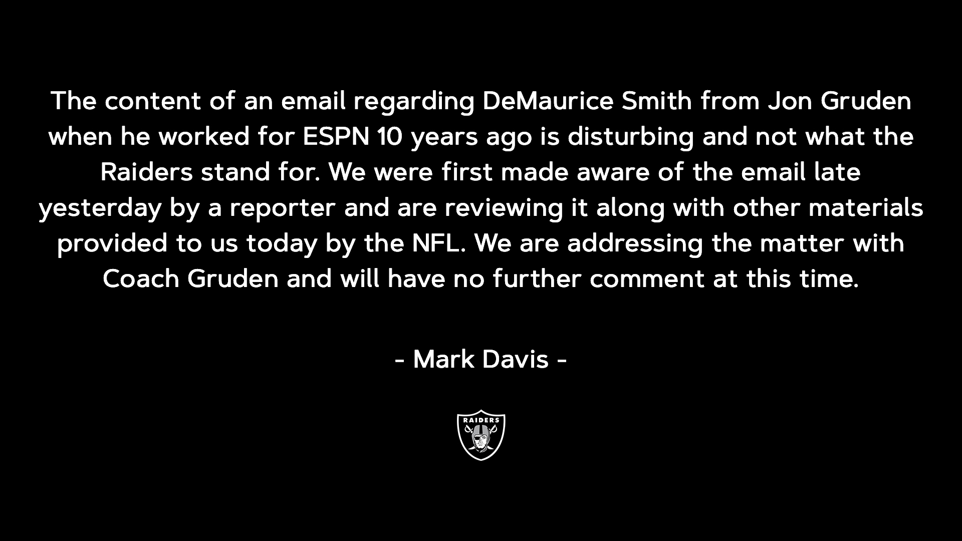 Here’s the statement from the Raiders released Friday afternoon and posted on Twitter: “The content of an email regarding DeMaurice Smith from Jon Gruden when he worked for ESPN 10 years ago is disturbing and not what the Raiders stand for. We were first made aware of the email late yesterday by a reporter and are reviewing it along with other materials provided to us today by the NFL. We are addressing the matter with Coach Gruden and will have no further comment at this time.”