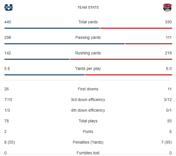 The Aggies outgained UNLV, 440 total yards to 330. UNLV’s 330 included a 75-yard run by Williams in the first quarter, which followed Utah State’s first quarter touchdown with a 100-yard kickoff return by speedy Savon Scarver.