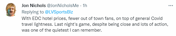 Thomas Bruny wrote on Twitter, “Did not renew my tickets for this season because of VGK’s lax attitude in helping stop pandemic. Mask compliance and enforcement is a joke. Proof of vaccination is needed to attend large public events. By the way … I am using my Raiders tickets.”