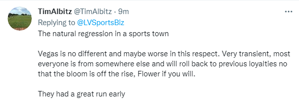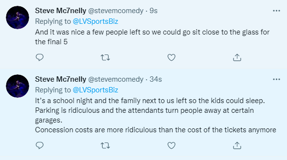 “There’s no buzz around this team anymore. Fleury was traded and the whole aura of the team from a fans prospective went flat (Not all fans). The players appear to be playing with no interest. Injuries, tickets prices (Although extremely cheap near game time) have a hand in it,” fan Josh @VGKHSK wrote on Twitter Thursday morning.