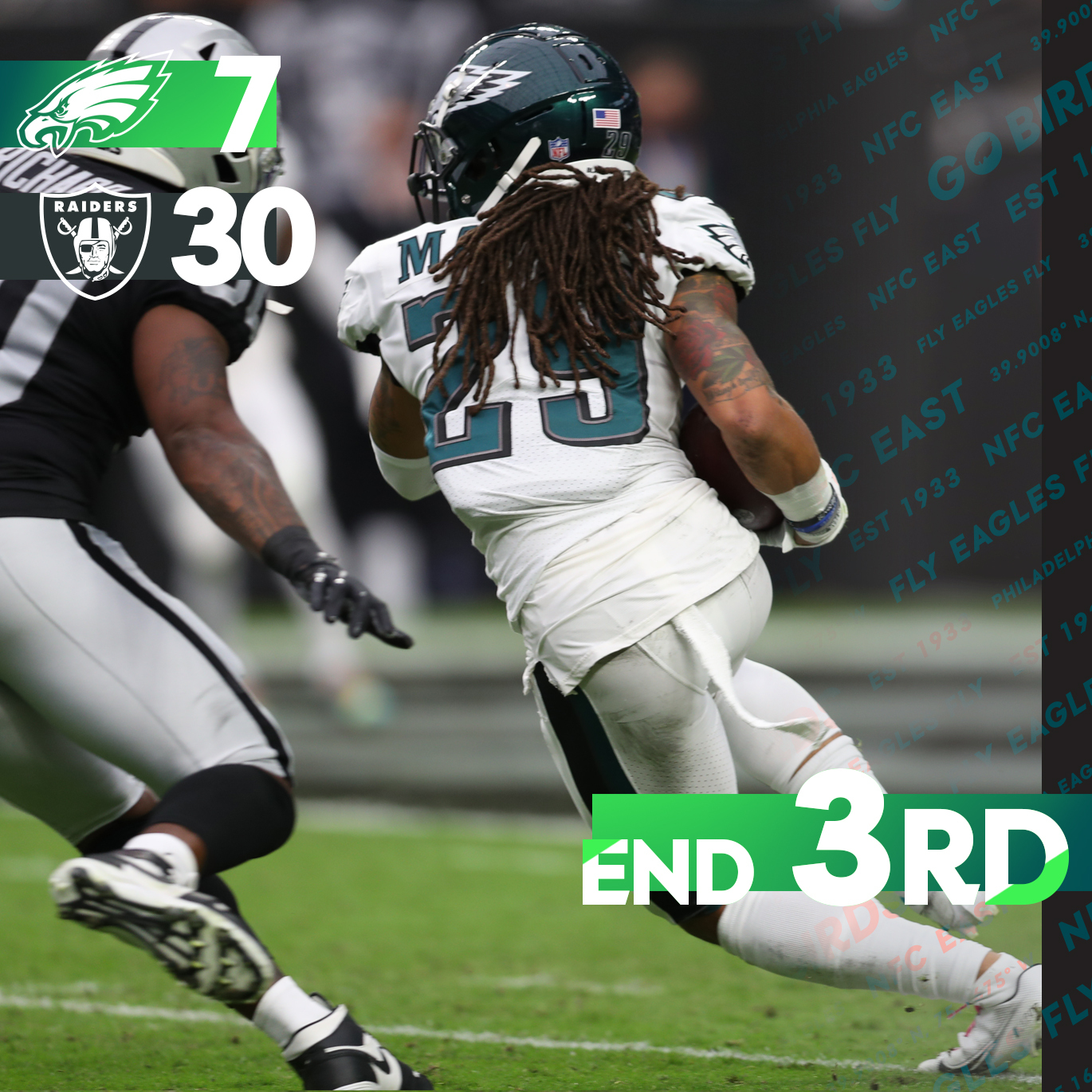 End of third quarter: Raiders 30 Eagles 7.