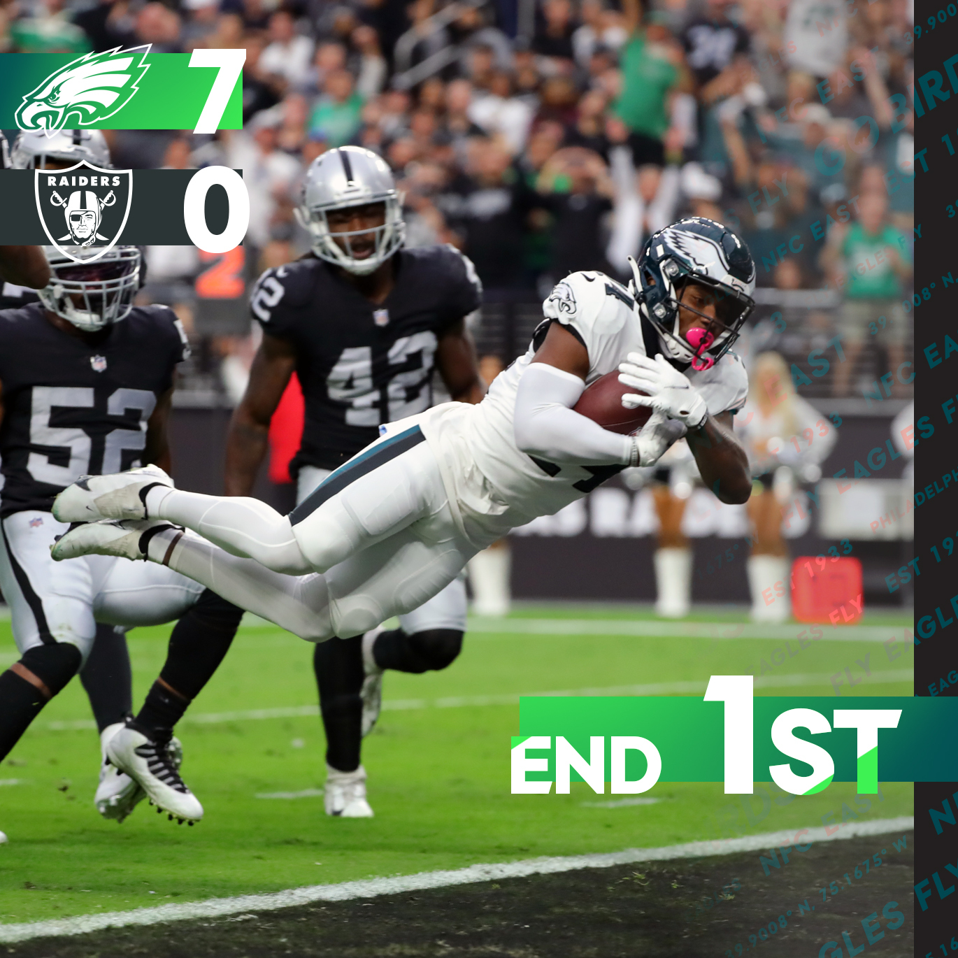Carr was intercepted on a deflected pass and after one quarter it was the Eagles 7 Raiders 0.