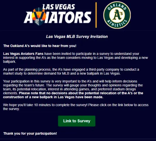 If you have 10 minutes to fill out a survey and if you’re a Las Vegas Aviators baseball fan, the Oakland Athletics would like to hear from you.