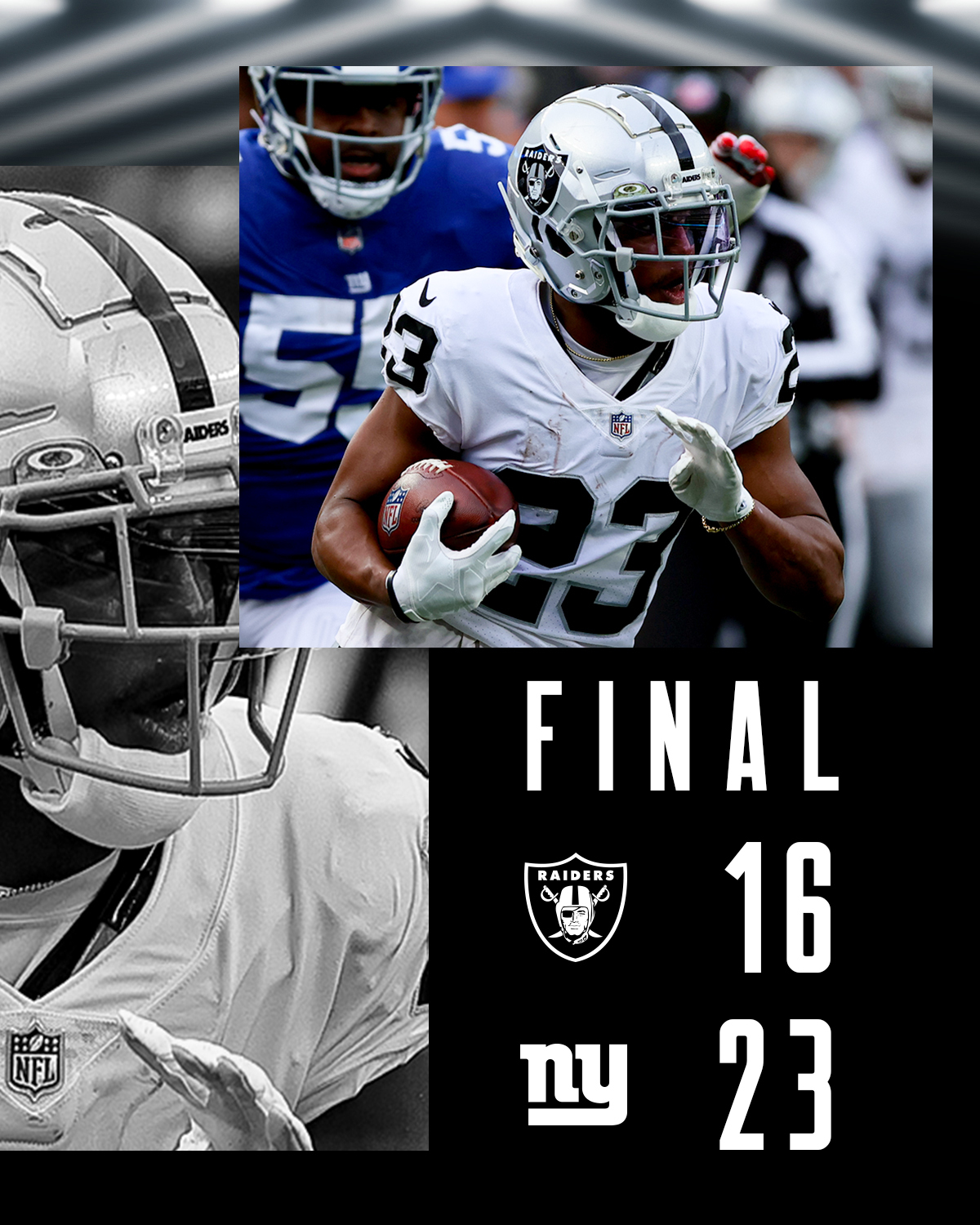 The Raiders outgained the Giants, 403-245, but could not convert drives into touchdowns. Normally reliable placekicker Daniel Carlson also missed a 25-yard field goal attempt — the shortest missed FG in the National Football League this season.