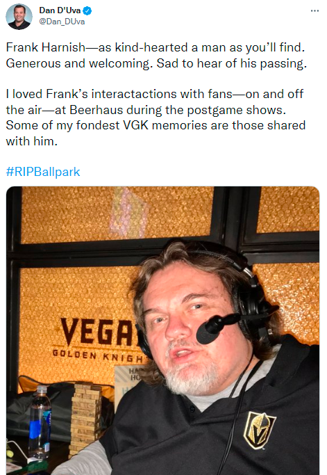 The Vegas Golden Knights sent this statement to LVSportsBiz.com Wednesday: ““Frank Harnish was as kind as he was passionate about all things sports and Las Vegas, and he will be missed by the Vegas Golden Knights. We extend our deepest sympathies to his family and friends.”