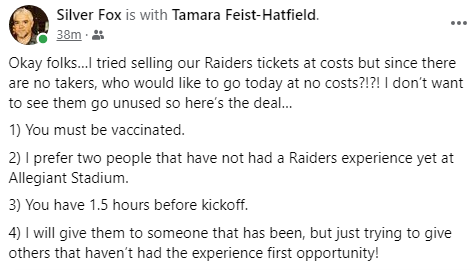 I also saw a lot of fans wearing masks outside the stadium. The Raiders were the first team to require proof of vaccinations for fans to attend home games in Allegiant Stadium. Fans then are allowed to not wear masks at Raiders home games. That policy contrasts with the Vegas Golden Knights’ guidelines, which do not require proof of vaccination. The Golden Knights have not expelled a single fan from T-Mobile Arena for violating the state’s indoor mask mandate. Most Knights fans do not wear masks at VGK games at T-Mobile Arena.