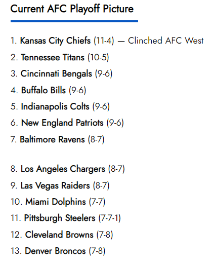With both the LA Chargers and Baltimore Ravens losing and each falling to 8-7, the winner of the Raiders (7-7) vs Broncos (7-7) game is in the hunt for an AFC playoff spot.