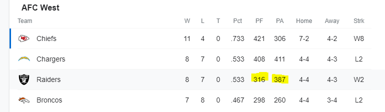 Check out the standings. The Raiders are plus one in wins and losses and minus 71 in points for and against.