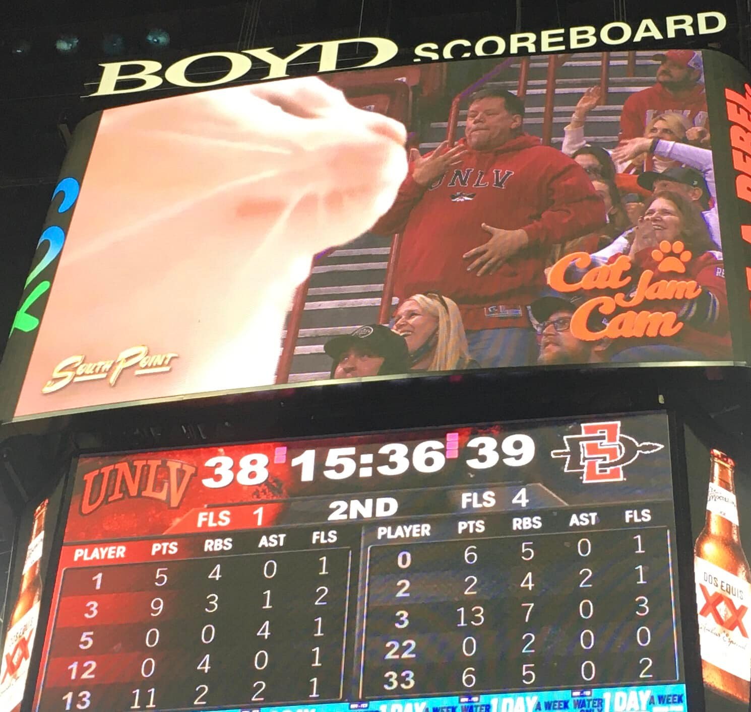UNLV senior guard Bryce Hamilton after the nationally televised game, in which CBS cameras captured a sea of empty red seats at the Thomas & Mack Center: “They’re a top 10 defensive team in the country, so they played their defense. They did it very well. We were very stagnant on offense.”
