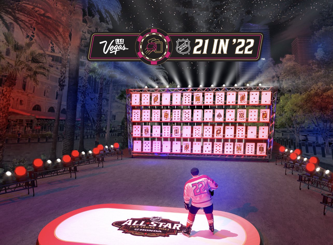From the NHL on this blackjack game: “Shutting down part of Las Vegas Boulevard to hang a full deck of oversized cards on a rack puts a new twist on street hockey. 21 in ’22 is a game of chance, strategy and skill. The object of the game is to achieve a hand of 21 without going bust, in the least number of shots. The player who wins two rounds is crowned Puck Shark.”