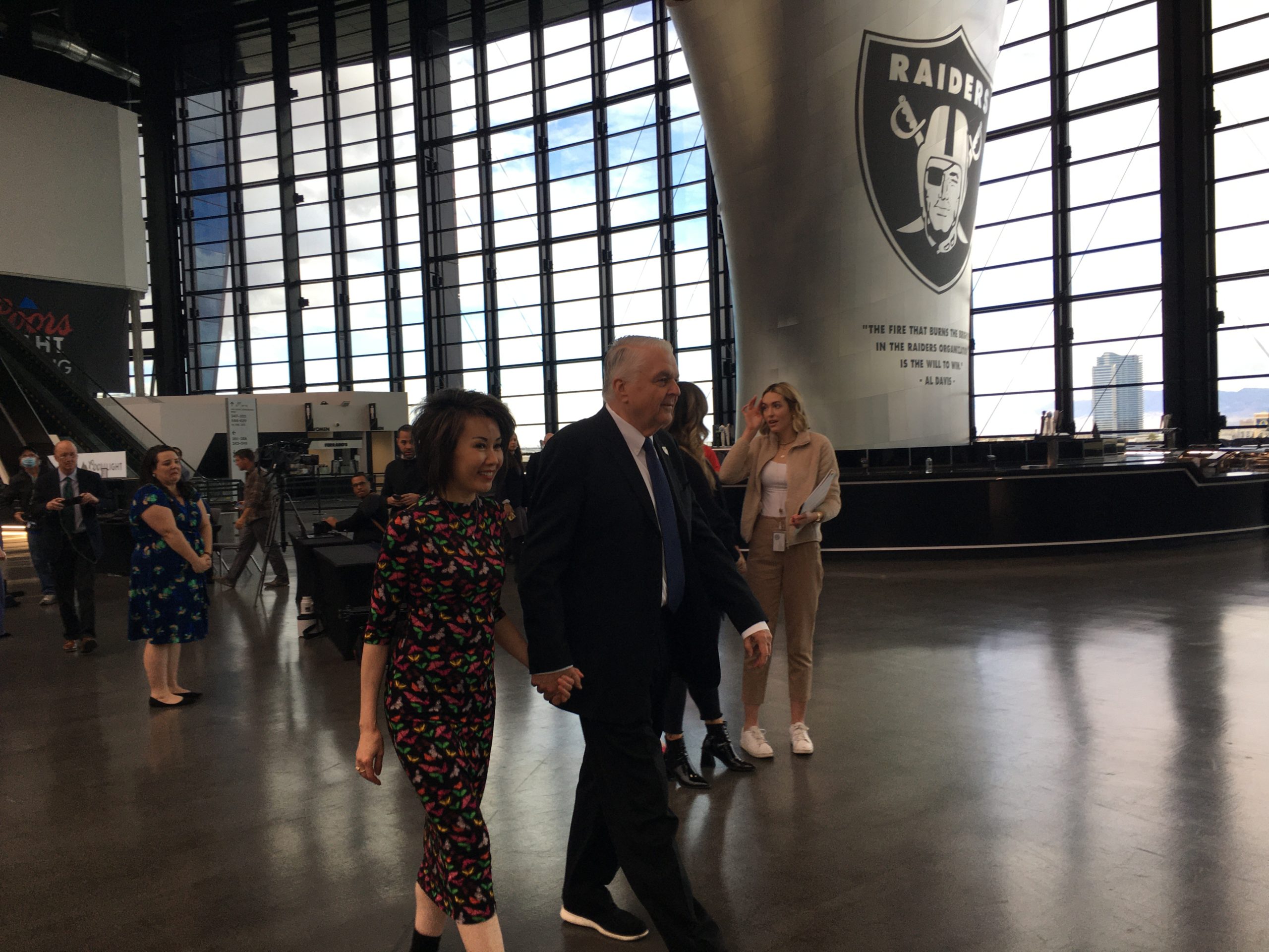 The Raiders stadium representatives, the NFL team and Sisolak’s people did not explain why the media was not allowed to take photos or video of the stadium bowl, which Sisolak used as a backdrop prop for the speech.