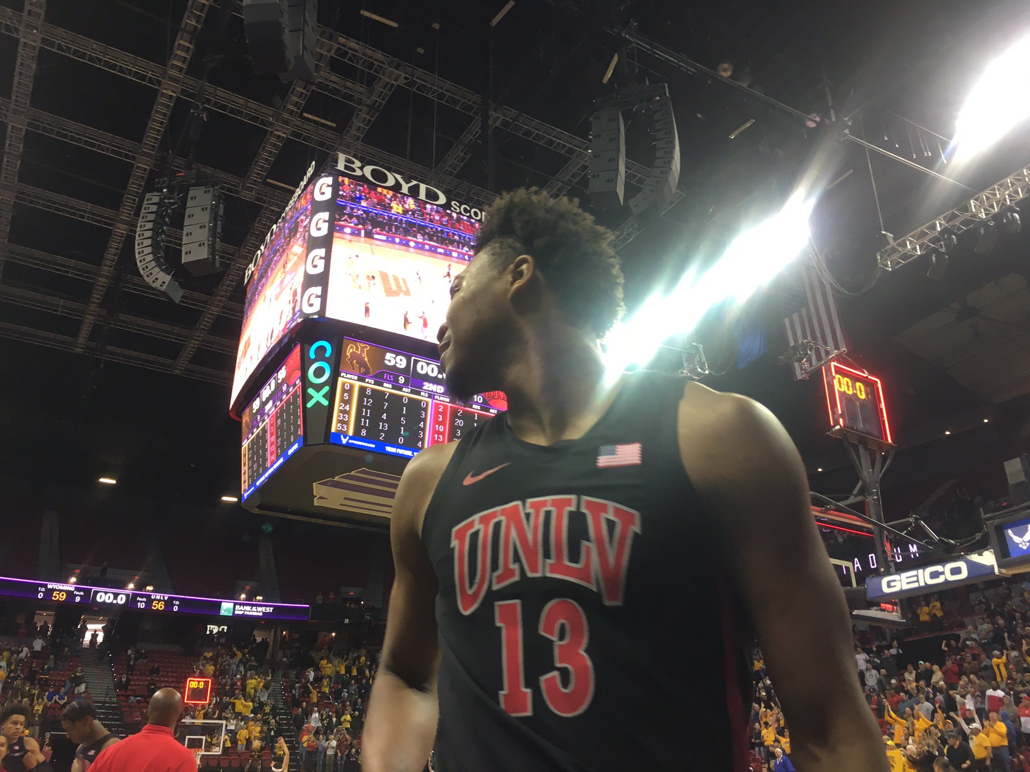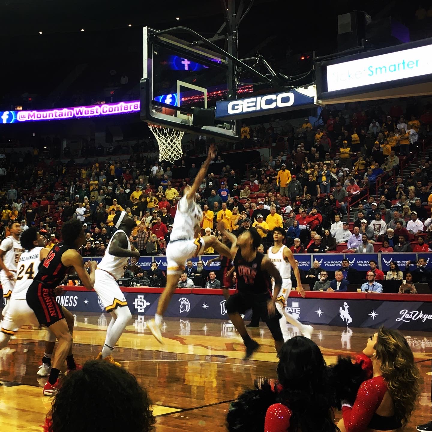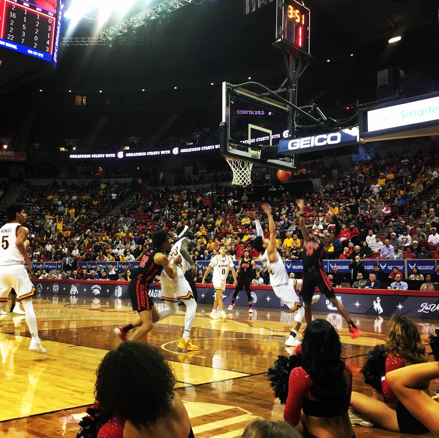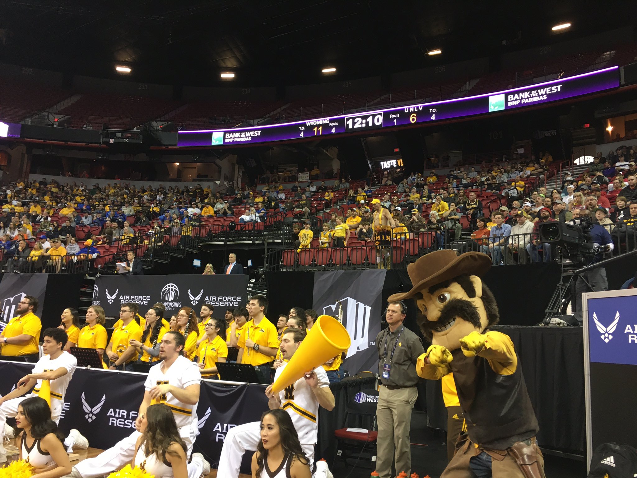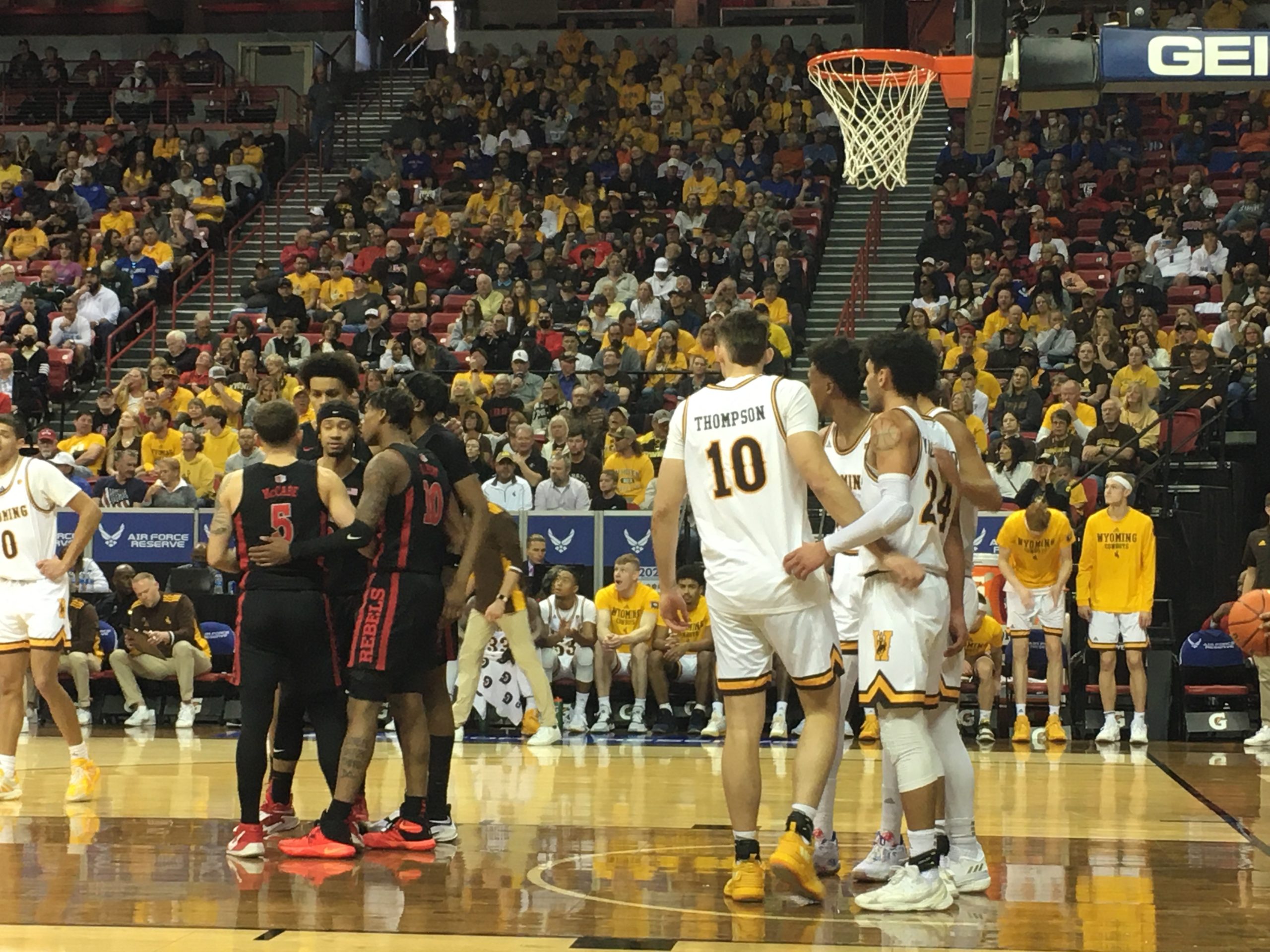 Both teams had followers in the stands, with yellow-clad Wyoming fans filling many of the seats. It was hardly a home court advantage for UNLV, which had its fair share of fans, too.