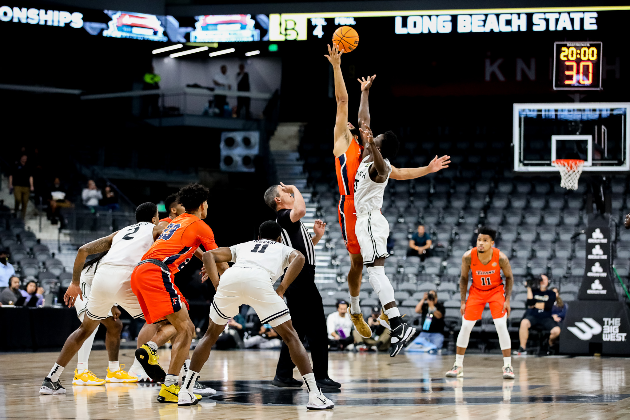 In the 8:30 PM game in the Big West men’s final, Long Beach State jumped out to a nice lead against Cal State Fullerton, but Fullerton led the Beach, 32-31, at the half.
