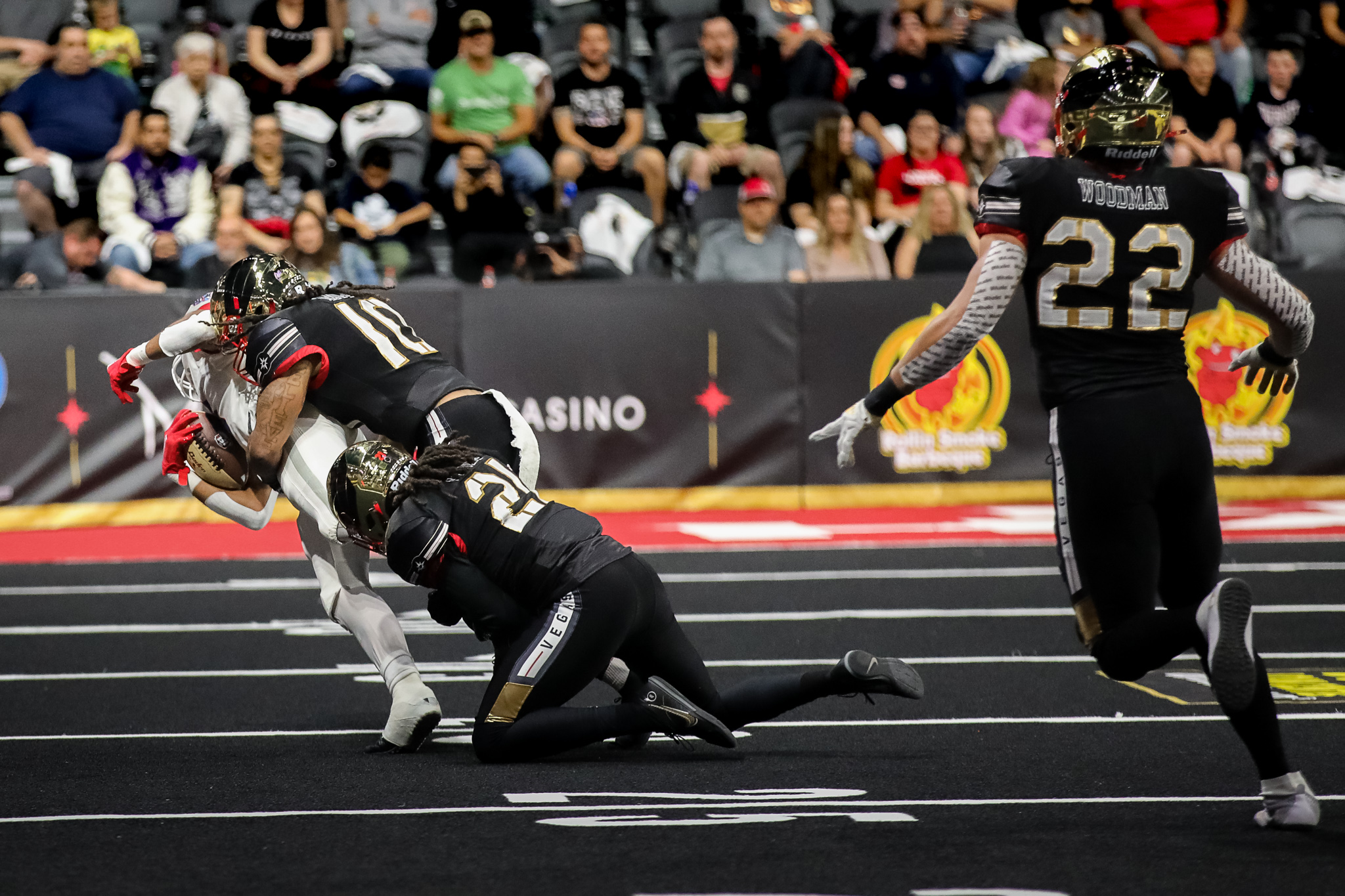 It was eight-on-eight football on the 50-yard field, which is black with red end zones and the Knight Hawks logo in the center. Foley created the Knight Hawks to have programming dates for his arena, which will also host his Henderson Silver Knights. minor league hockey team.