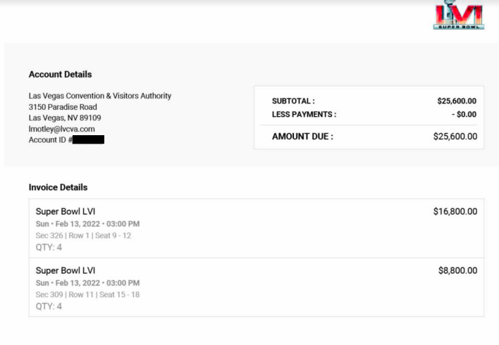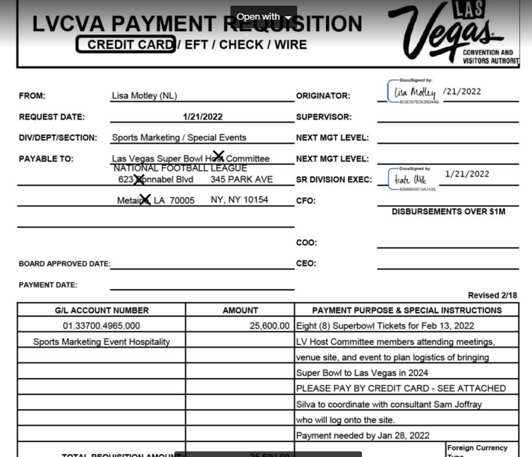 An LVCVA payment document showed Motley requested $25,600 for the eight tickets, host committee members attending and the venue site “to plan logistics of bringing Super Bowl to Las Vegas in 2024.”